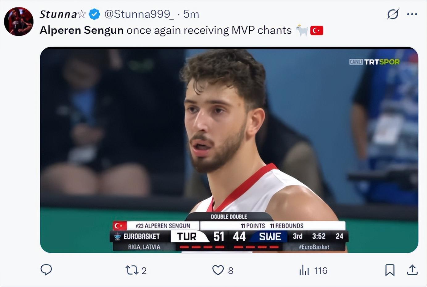 北京时间9月6日,2025年男篮欧洲杯1/8决赛,土耳其男篮以85-79逆转瑞典男篮晋级八强。这场比赛上半场土耳其一直落后瑞典,第三节土耳其一度领先到11分,末节瑞典又抹平分差两队鏖战至最后一刻,申京关键自抢自投+关键封盖+关键暴扣+关键两罚一中,他在决胜时刻可以说一人扛起球队。