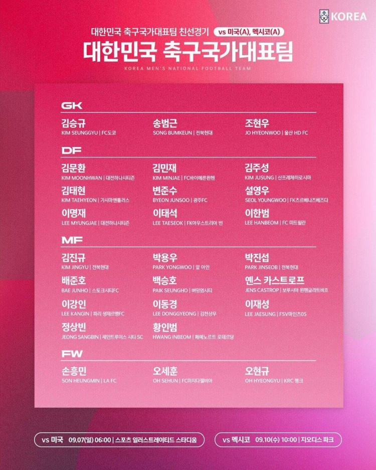 8月25日讯 今日,韩国队公布了最新一期国家队大名单,孙兴慜、李刚仁、金玟哉领衔,归化球员卡斯特罗普首次入选。韩国队将在9月飞往美国,与美国队和墨西哥队交手。