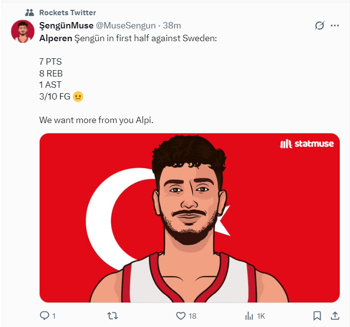 瑞典的策略就是封堵申京的个人进攻,包夹迫使申京提前传球,结果土耳其此役的外线的确不准,申京上半场10中3手感也不佳,只拿到7分8篮板1助攻。