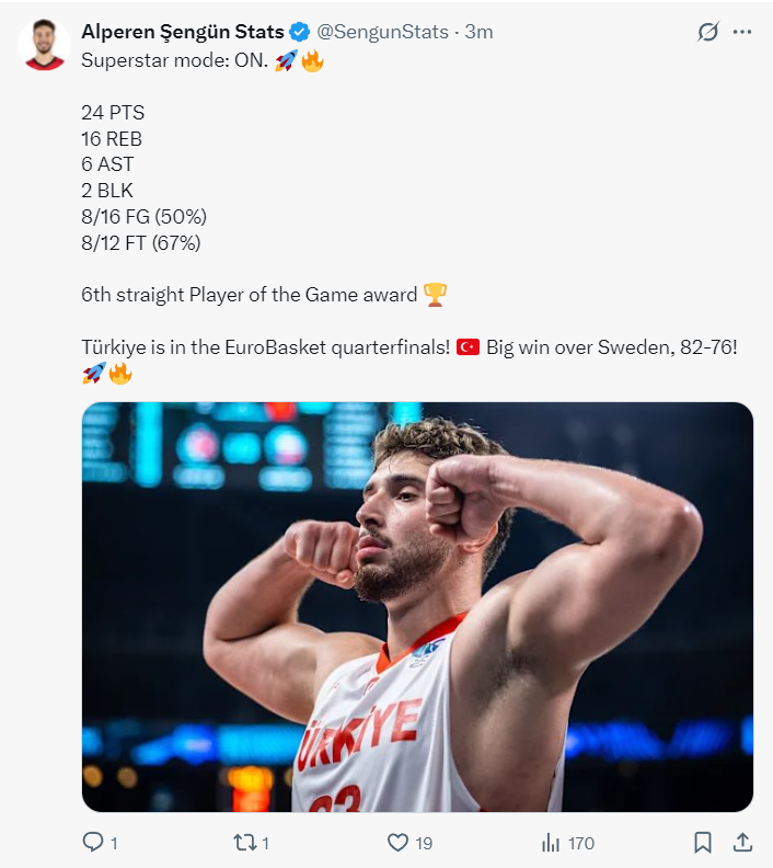 北京时间9月6日,2025年男篮欧洲杯1/8决赛,土耳其男篮以85-79逆转瑞典男篮晋级八强。这场比赛上半场土耳其一直落后瑞典,第三节土耳其一度领先到11分,末节瑞典又抹平分差两队鏖战至最后一刻,申京关键自抢自投+关键封盖+关键暴扣+关键两罚一中,他在决胜时刻可以说一人扛起球队。